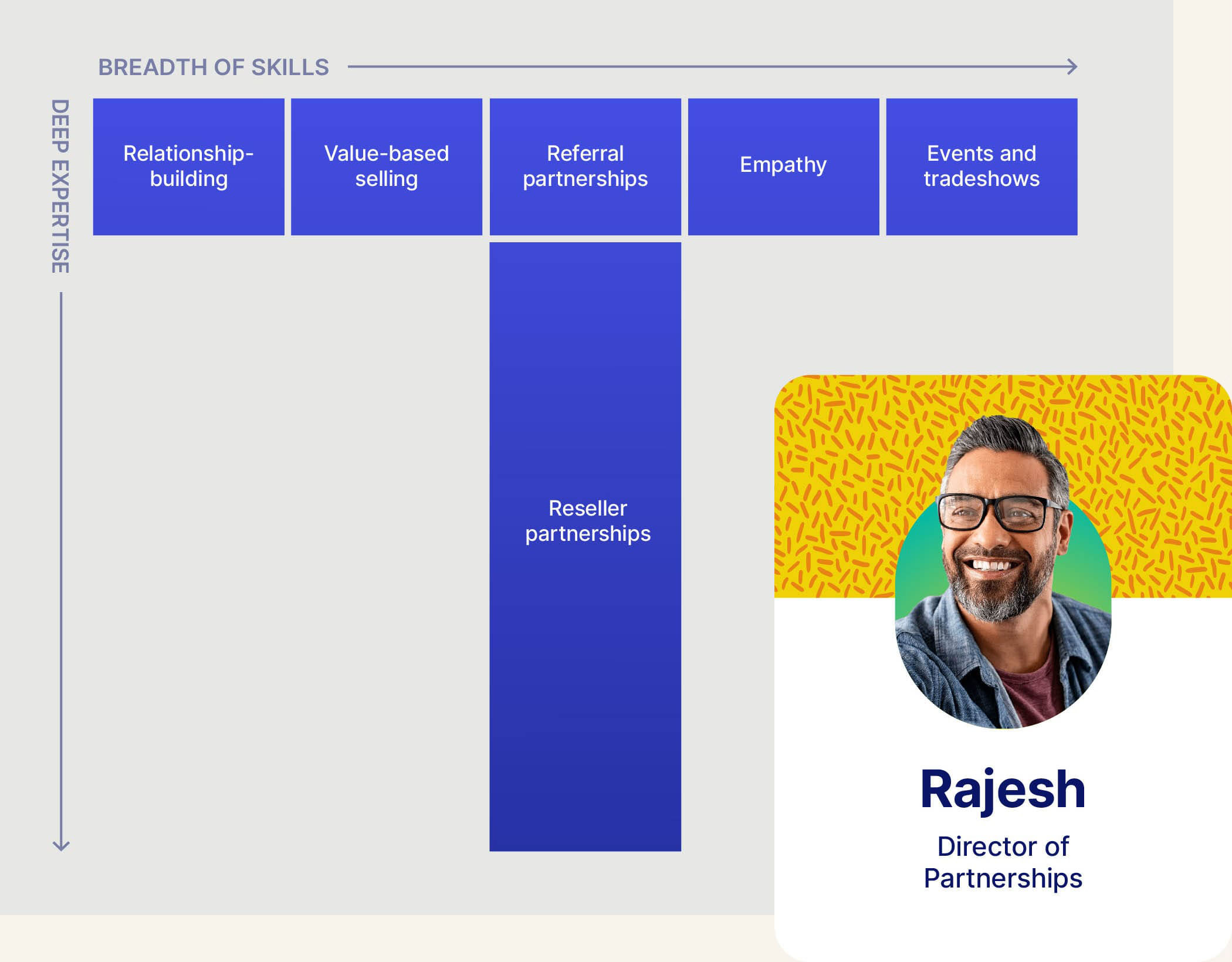 Rajesh is a social and affable guy. A natural salesperson, building real relationships and closing deals has never been hard for him. Now that live events are coming back, his company wants to host more partner meet-ups and sponsor more trade shows. While schmoozing at the booth is fun and easy for him, he’s learning the ins and outs of organizing live events. To strengthen his “T” he’s built up a mentoring relationship with a seasoned events marketer on his company’s marketing team proper. They have a weekly coffee chat where she imparts wisdom from her career and coaches him to run his own events, which in turn can help him grow his company’s ecosystem.
